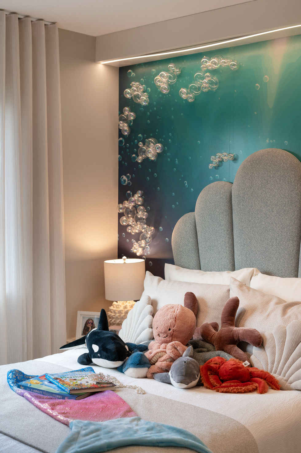 As the lead designer, I guided the project from space planning and site coordination to custom millwork and FF&E design. Highlights include a custom living room feature wall, tailored headboards, statement wallcoverings, and detailed CNC tree cutouts. The nursery was brought to life with a cozy woodland theme, while the young girl’s bedroom became a dreamy underwater escape inspired by The Little Mermaid. To make the vision feel real, I added clear orb ornaments as floating 3D bubbles and created a custom underwater wall vinyl—one of my favorite creative moments in the home.